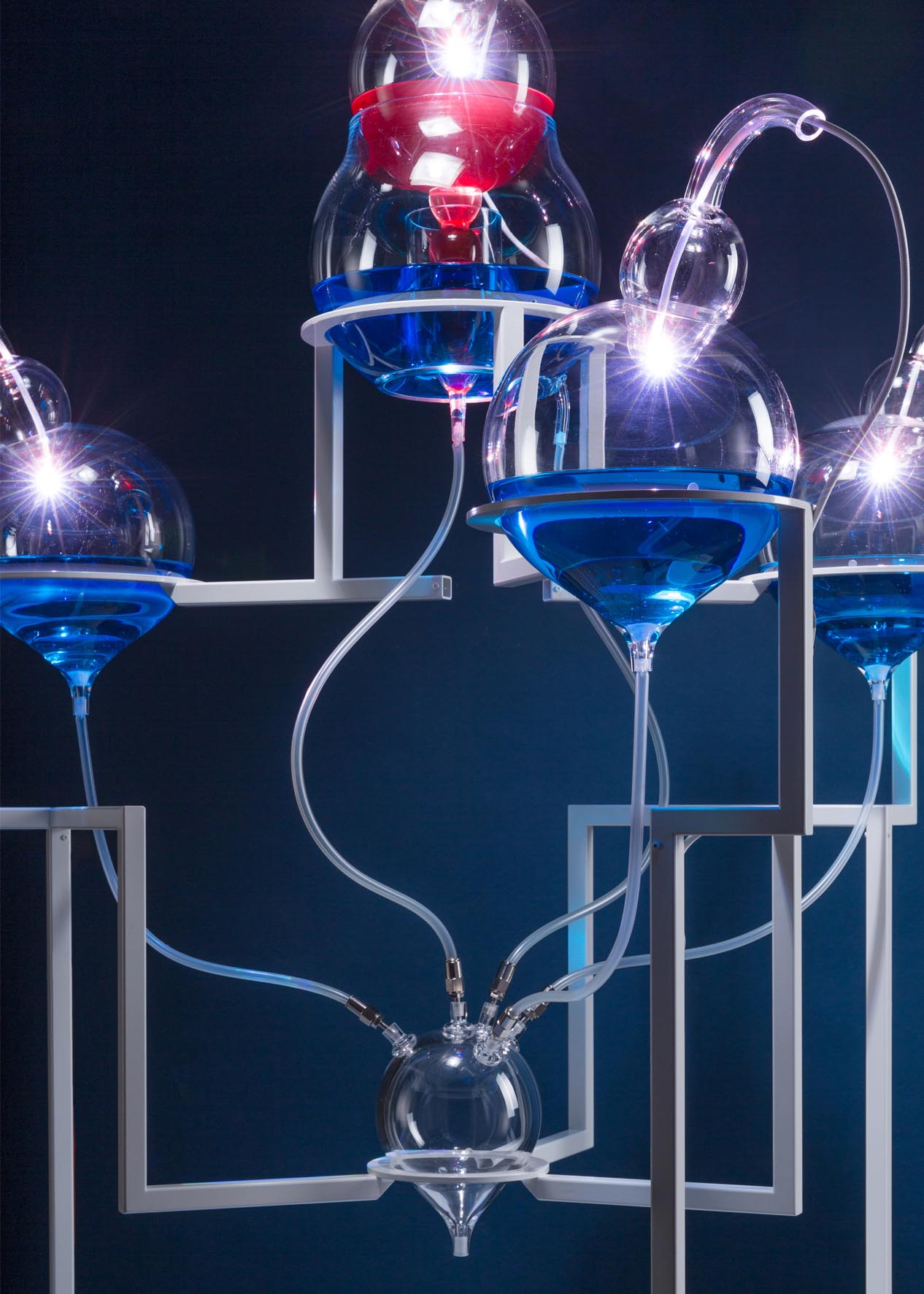 The apparatus is connected to a smartphone or digital tablet. Inside this virtual space, the player is represented by a liquid droplet that sucks in neighboring liquids as they approach. The player controls this droplet through the gyroscope by rotating his device. As the player siphons off the virtual liquids, a mechanical servo valve is activated, mixing physical liquids into the final, drinkable vial. As players reach the final level, a cul de sac fills up with the various colored liquids they have collected throughout the game. Each physical liquid is related to the color of the liquid discovered in the game.
