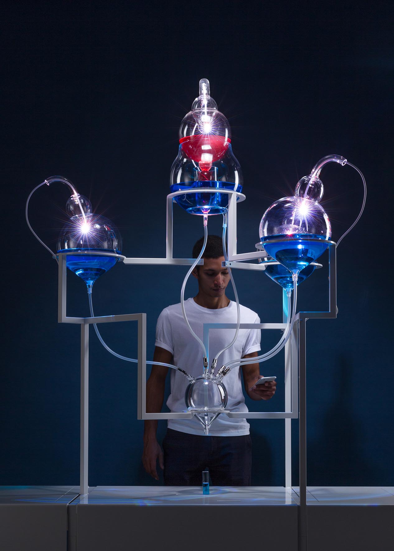 A hybrid cocktail apparatus inspired by the world of alchemy. As players descend into the depths of a smartphone game their actions within the app concoct a unique elixir from the innards of the physical machine.