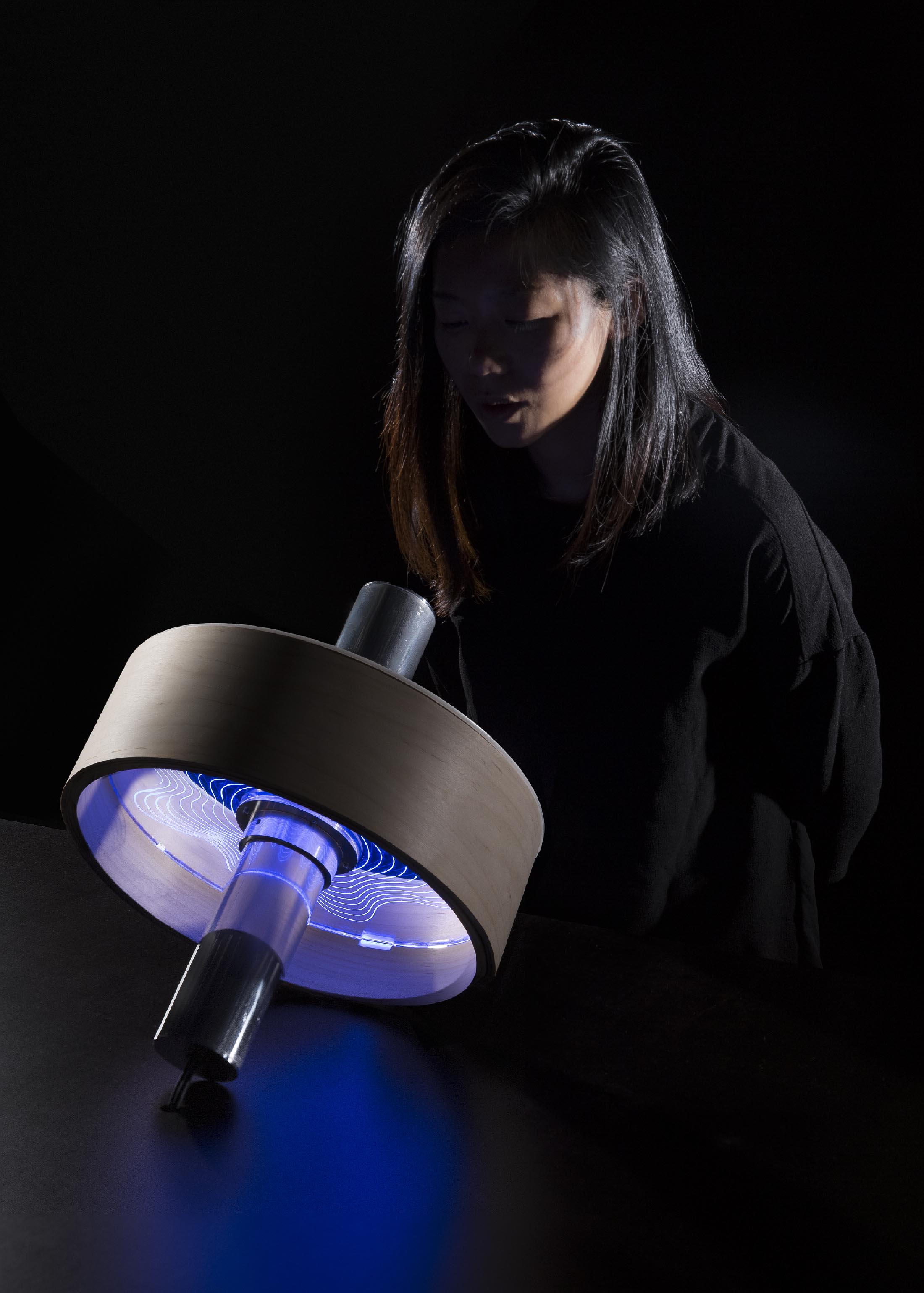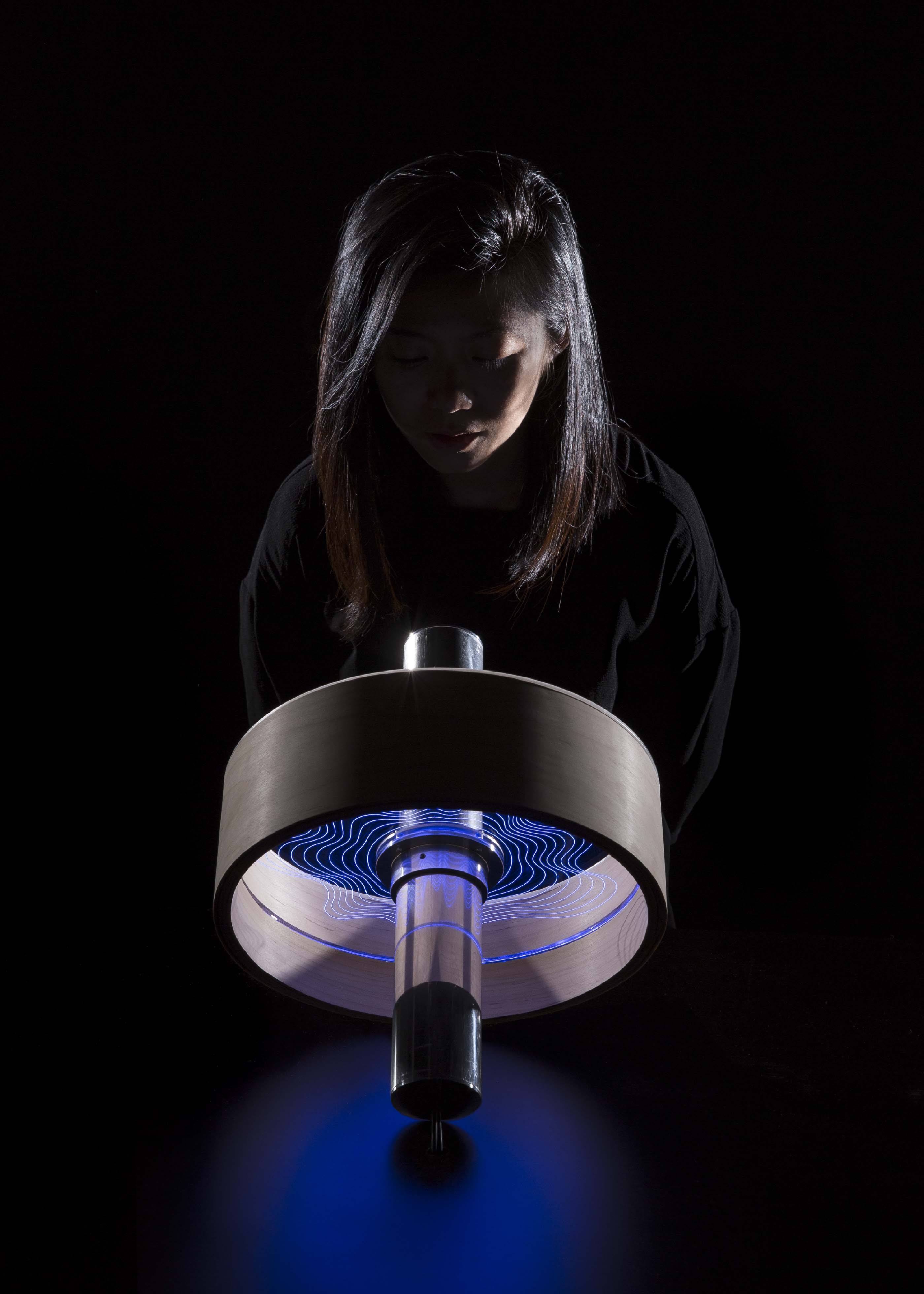Sue est donc la mise en scène d’une fiction, sous forme d’immersion interactive grâce à un système de reconnaissance vocale. Lorsqu’un utilisateur est détecté, il va déclencher une discussion qui va différer d’une personne à l’autre selon les réponses qu’elle va procurer et qui, reconnues par l’objet au moyen d’un micro, vont activer une branche ou l’autre de la discussion. Les 6 enceintes disposées en cercle autour de cet objet permettront alors de spatialiser le son et d’offrir ainsi un effet d’ubiquité à cette AI ainsi qu’une expérience sonore à l’utilisateur. Plus celui-ci s’enfoncera profondément dans les méandres des réflexions de cet être virtuel, plus les couches sonores se multiplieront pour créer une ambiance de plus en plus étrange et oppressante.